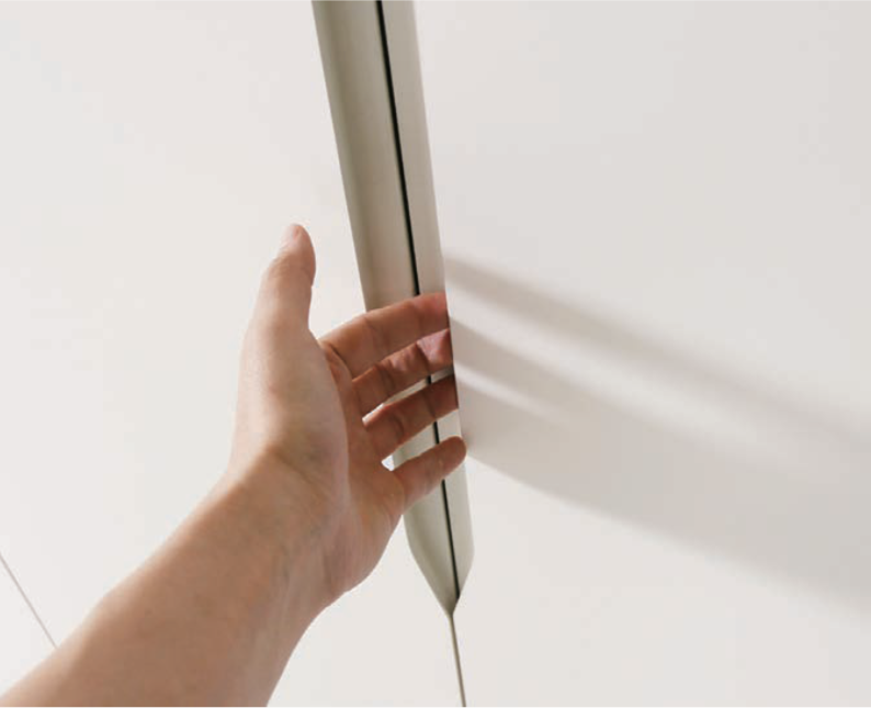 별도의 손잡이가 돌출되지 않아 매끈하고 심플한 디자인을 연출할 수 있으며, 사용자의 손끝이 닿는 부분은 부드러운 곡선 처리로 편안한 사용감을 제공합니다.